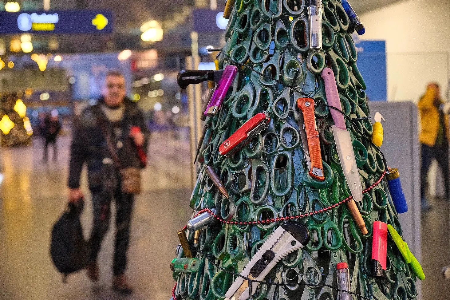 **锋利的装饰。**立陶宛维尔纽斯机场的安保人员 制作了一棵用刀具、剪刀、打火机、刀片和其他从旅客身上没收的违禁物品制成的违禁圣诞树。