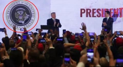 在当天的活动现场,从特朗普走上舞台之后,背后的总统徽章就变成了正确的,并且在特朗普随后的80分钟讲话中,屏幕上也一直显示着正版的徽章。