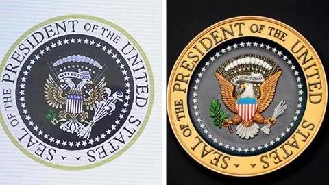 更甚的是,正版美国总统徽章的一只鹰爪抓着13只箭,代表着战争,而山寨徽章上,双头鹰则抓着一把高尔夫球杆。