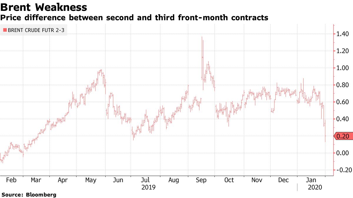 除了布伦特的头条价格外,实物和衍生品市场的其他所有指标也指向市场疲软。所谓的时间价差,衡量不同交货时间合同之间的价格差异,已经崩溃——这表明短期需求预计将保持疲软。