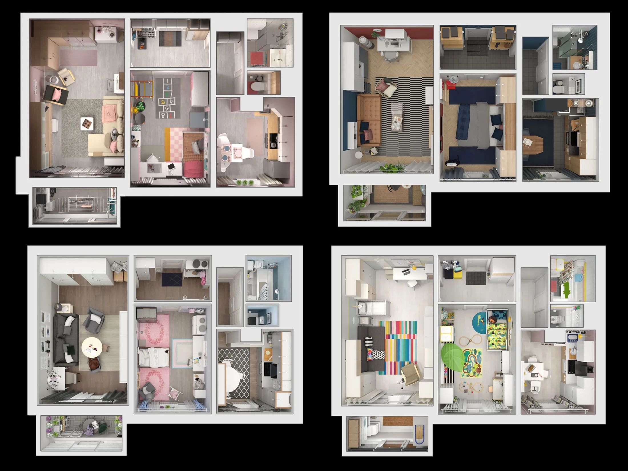 Kvartiroteka服务提供14种建筑类型的常见公寓布局设计选择。一个为家庭住宅建议的布局展示了一个适合两个不同年龄孩子共享的儿童房。一个窗帘将房间分成两部分,并展示了适合空间的推荐衣柜、抽屉柜和壁挂式书架。在走廊里,天花板下的架子节省了空间,墙上有挂钩可以挂滑板。