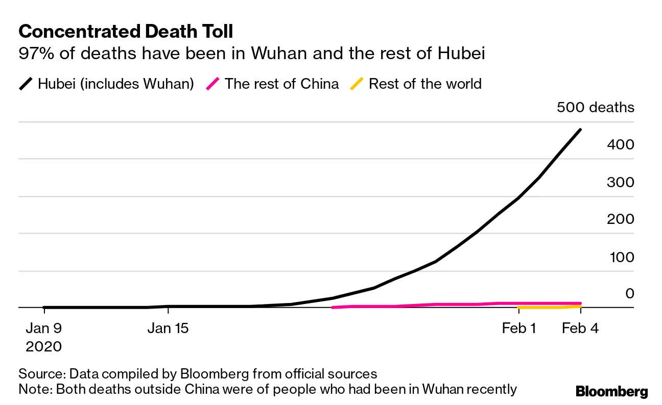值得注意的是,大部分死亡人数发生在湖北省及其省会武汉,病毒首次出现于此。湖北省占死亡人数的90%以上,感染人数的三分之二。