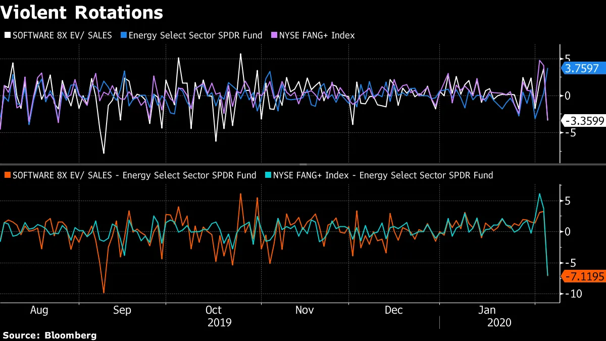 主导1月的成长优于价值的交易在 星期三 遭遇了巨大的挫折——当时10年期收益率创下了今年最大的涨幅。长期被压制的能源股相对于NYFANG指数的表现是自2014年后首次最佳,并且超过了昂贵的软件股,这是自9月以来的最大差距。