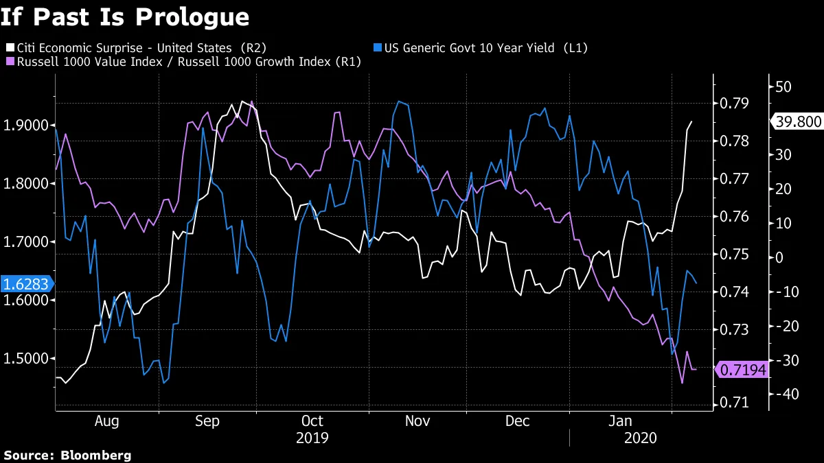 这种动态能走多远?好吧,你可能应该问一下国债市场。上一次经济意外指数上升而收益率上升时,价值股战胜了成长股。