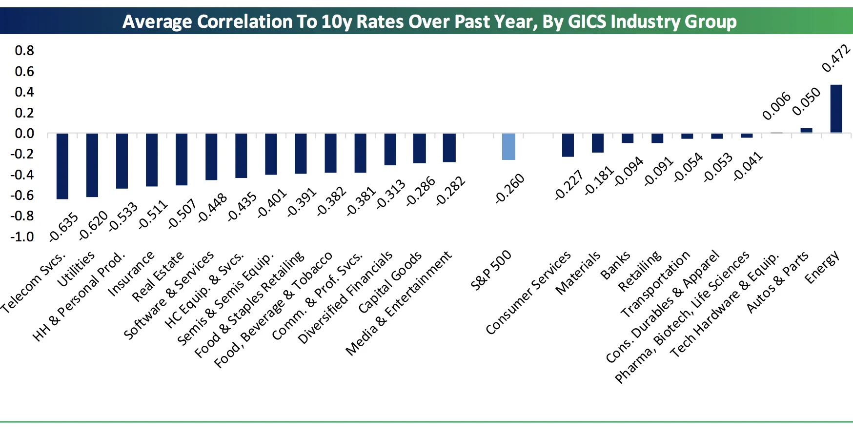 “在我们看来,科技公司面临上升收益率的风险是相当合理的,”他们写道。因此,对于更高的利率,像电信服务或软件和服务这样的行业应该被避免,而应选择能源,这将是近期趋势的一个相当戏剧性的逆转。”