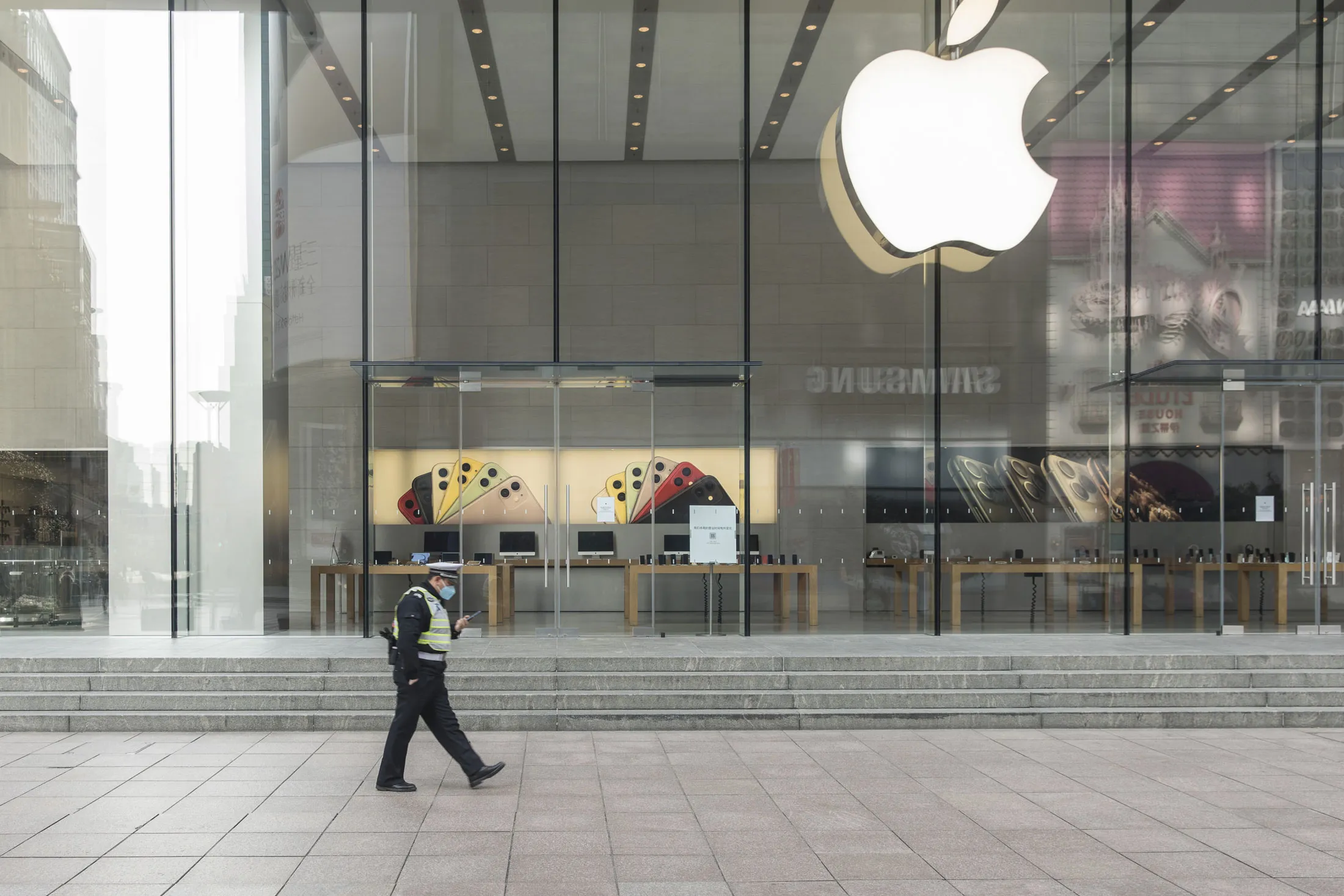 一名戴着防护口罩的警察于2020年2月5日走过一家关闭的苹果店。摄影师:沈其来/彭博社苹果已关闭在中国的所有42家零售店。上个月,这家iPhone制造商在2019财年在大中华区的销售额约占17%,由于疫情爆发带来的不确定性,给出了比平常更宽的当前季度收入范围。