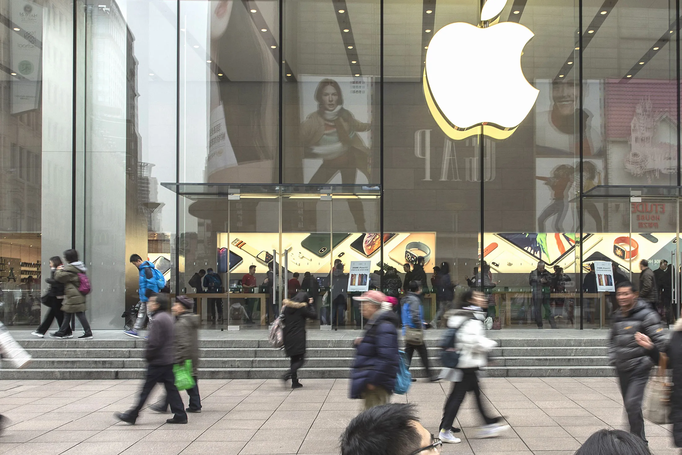 行人于2019年1月29日走过上海的一家苹果店。摄影师:沈其来/彭博社