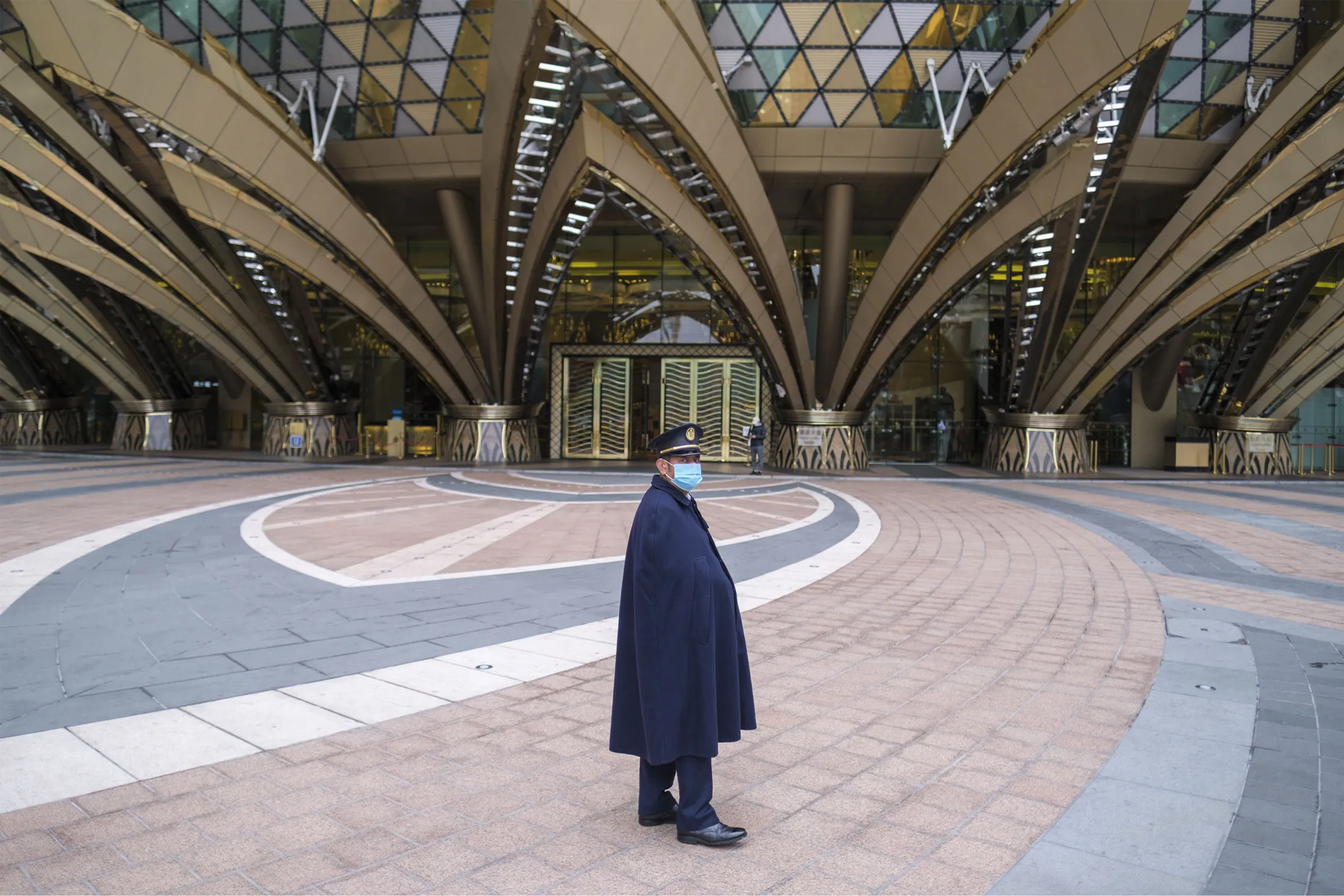 一名佩戴防护口罩的员工于2020年2月5日在澳门的葡京赌场前站立。摄影师:彭博社澳门的赌场,这个世界上最大的赌博中心,在 两周的暂停下关闭。这是有史以来最长的停业,也是仅有的第二次,第一次是在2018年台风导致33小时的停业。
