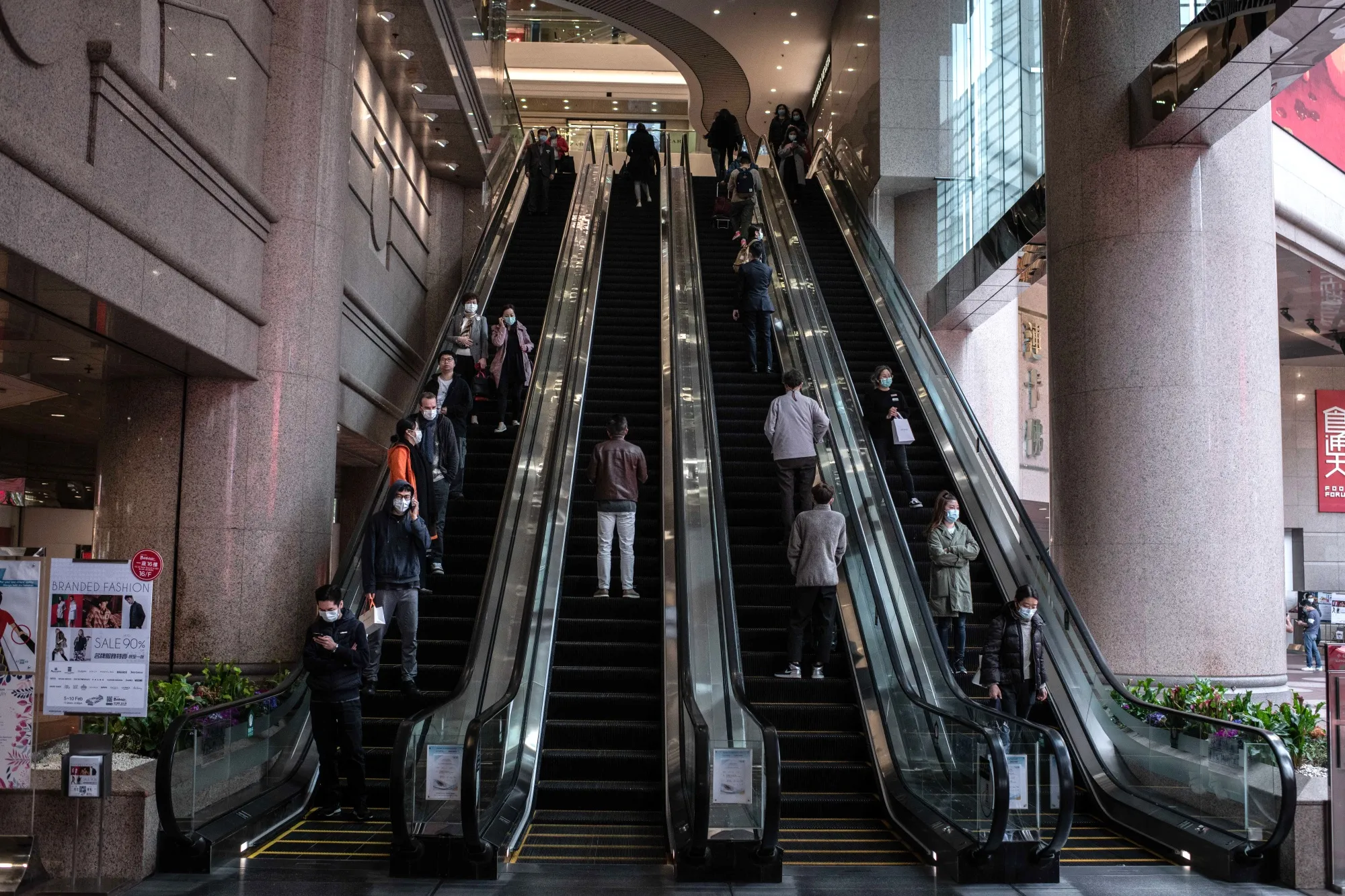 在2015年8月9日,购物者在香港铜锣湾购物区的时代广场购物中心乘坐自动扶梯。摄影师:肖梅·奥列罗斯/彭博社