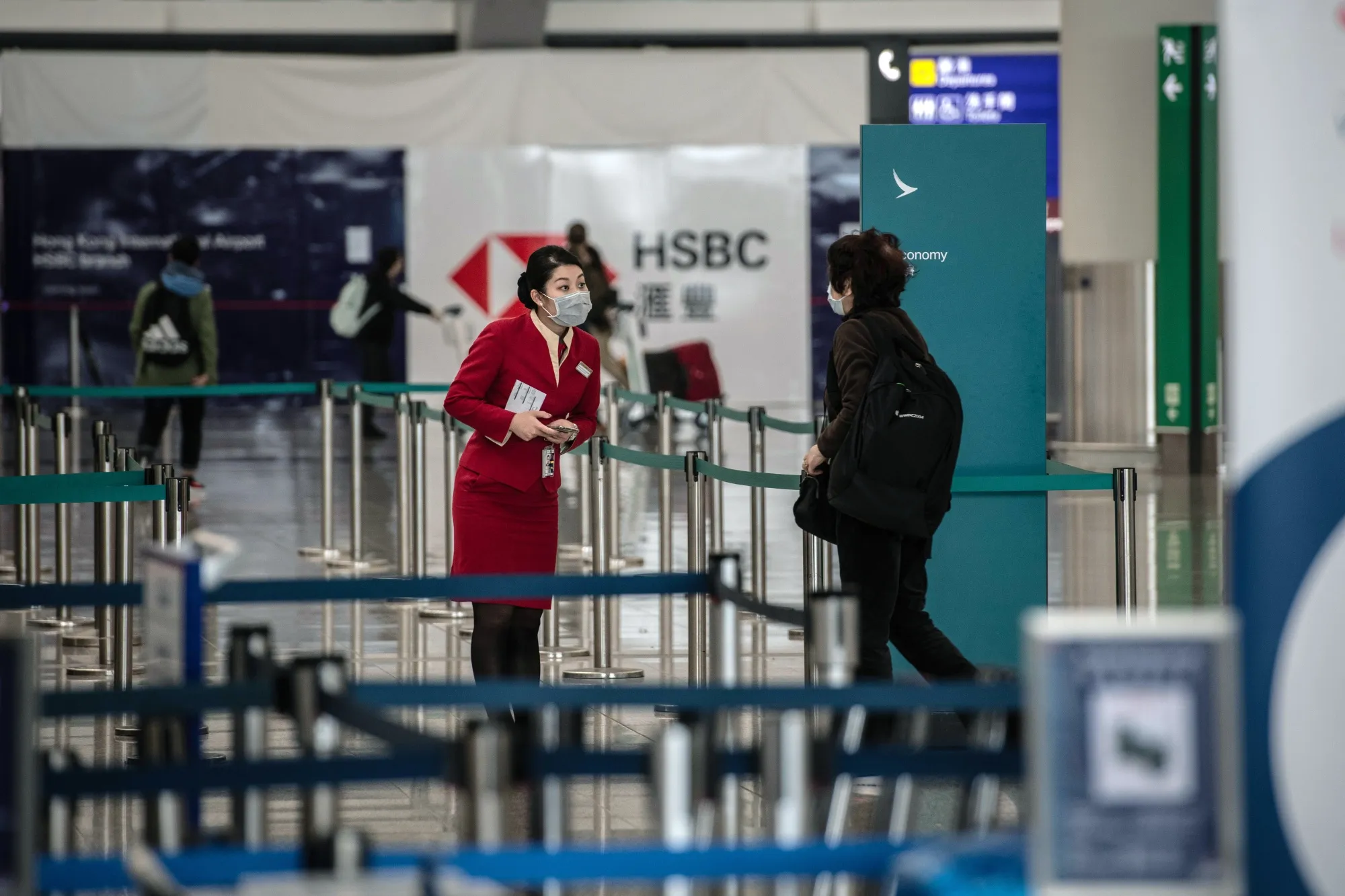 一名戴着防护口罩的国泰航空员工在2020年2月6日与香港国际机场的一名乘客交谈。摄影师:伊万·阿布雷乌/彭博社全球航空公司已暂停往返中国的服务,中国是世界上最繁忙的旅行市场之一。取消航班已扩展到北京和香港等主要枢纽,英国航空、新加坡航空和联合航空等航空公司已暂停航班。