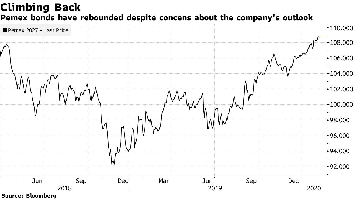 到期于2027年的Pemex债券自2018年11月的低点以来上涨了近五分之一,尽管这家庞大的公司在努力实现雄心勃勃的政府生产目标,但其交易价格仍约为每美元109美分。