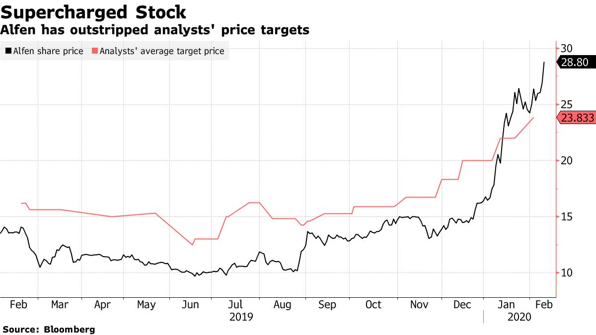 在电动车制造商特斯拉公司发生的较不极端的版本中,Alfen的股票在2020年获得了76%的涨幅,势头不断增强。