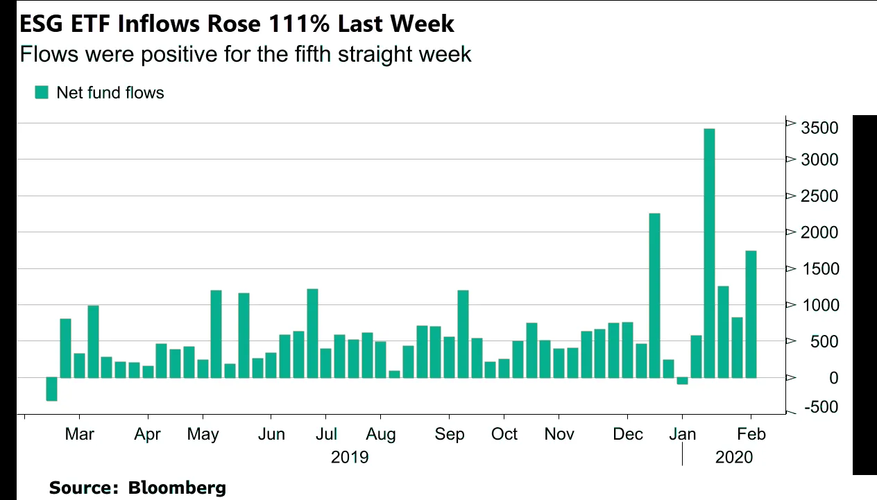 现金正大量涌入专注于负责任投资的基金。上周可持续交易所交易基金的流入量增长了111%,达到了17.3亿美元,这是连续第五周在假期后小幅下滑后的增长。与环境、社会和治理目标挂钩的两个最大信用ETF的资产接近10亿美元,而贝莱德最近对气候意识的承诺也得到了回报,推出了一只新的ETF,首发金额为$6亿(尽管下面的图表显示贝莱德还有很长的路要走)。然而,所有迹象表明,这是一场ESG ETF的繁荣。但从更大的角度来看,这是一笔小额资金。2019年,ESG ETF的净流入约为80亿美元。当考虑到所有在美上市的ETF去年吸引了3300亿美元时,就清楚了还有很多工作要做。