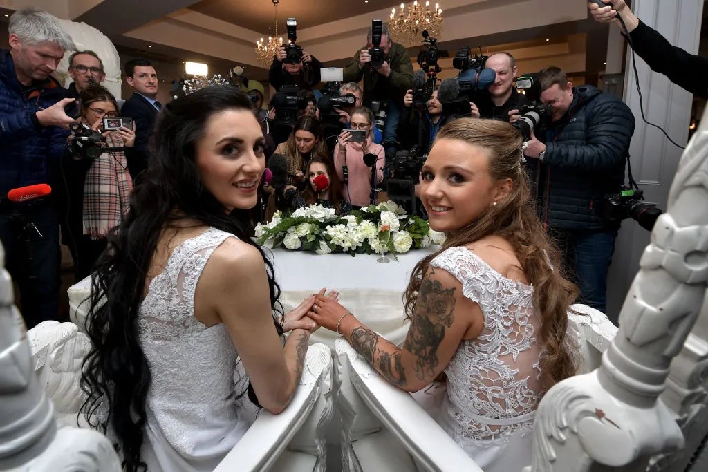 **变革的象征。**贝尔法斯特夫妇罗宾·皮普尔斯和沙尔尼·爱德华兹结婚,这是北爱尔兰在该省成为英国最后一个实施婚姻平等的地区后举行的首场同性婚礼。