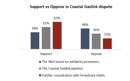 根据安格斯·里德研究所进行的一项民意调查,五分之二的加拿大人表示支持抗议者,但略微多数人支持海岸天然气链接项目本身。