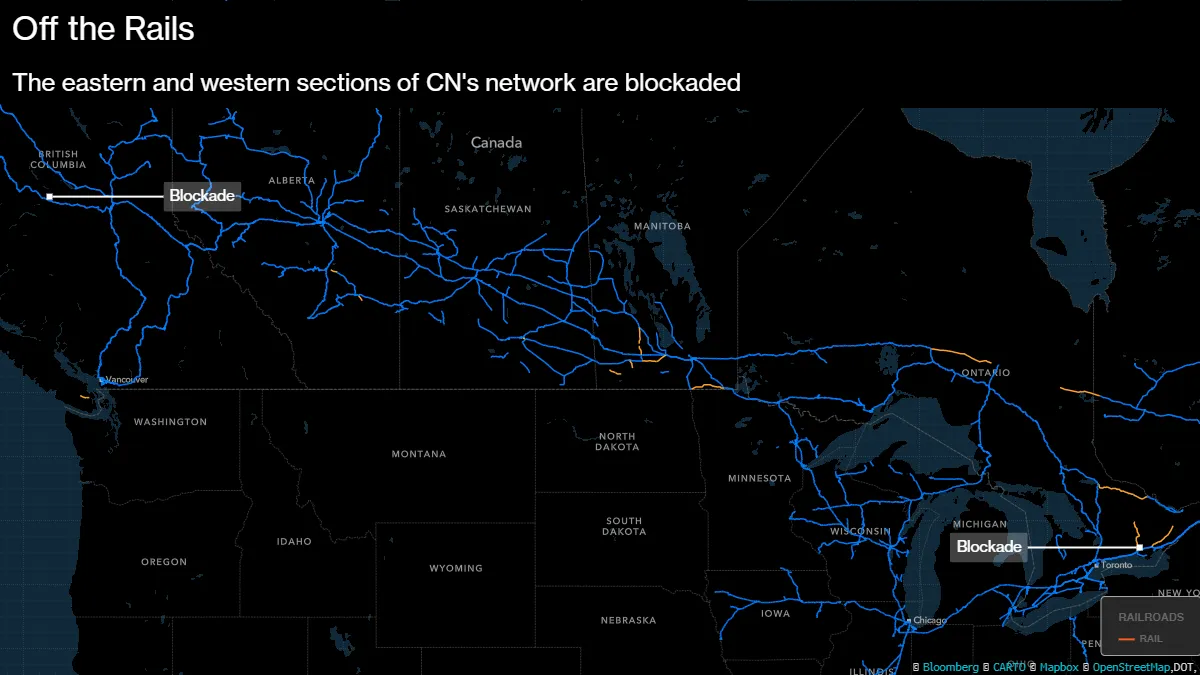 CN Rail在周四表示,它被迫开始关闭在东加拿大的运营,这可能很快导致临时裁员,该公司在一份声明中表示。曼尼托巴省的封锁已被清除,不列颠哥伦比亚省的封锁可能很快得到解决,但安大略省的封锁仍在持续,这家总部位于蒙特利尔的公司表示。