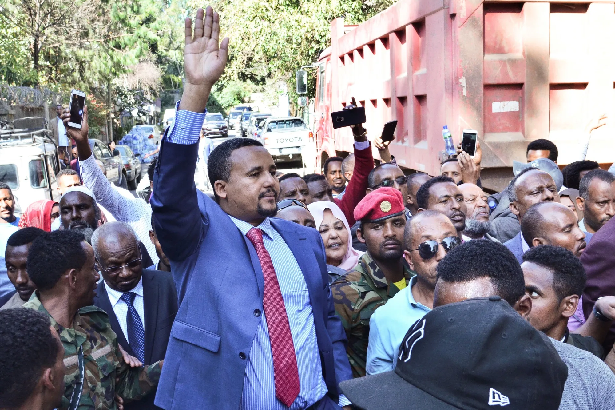 贾瓦尔·穆罕默德在埃塞俄比亚首都亚的斯亚贝巴的家外向支持者发表讲话摄影师:STRINGER/AFP