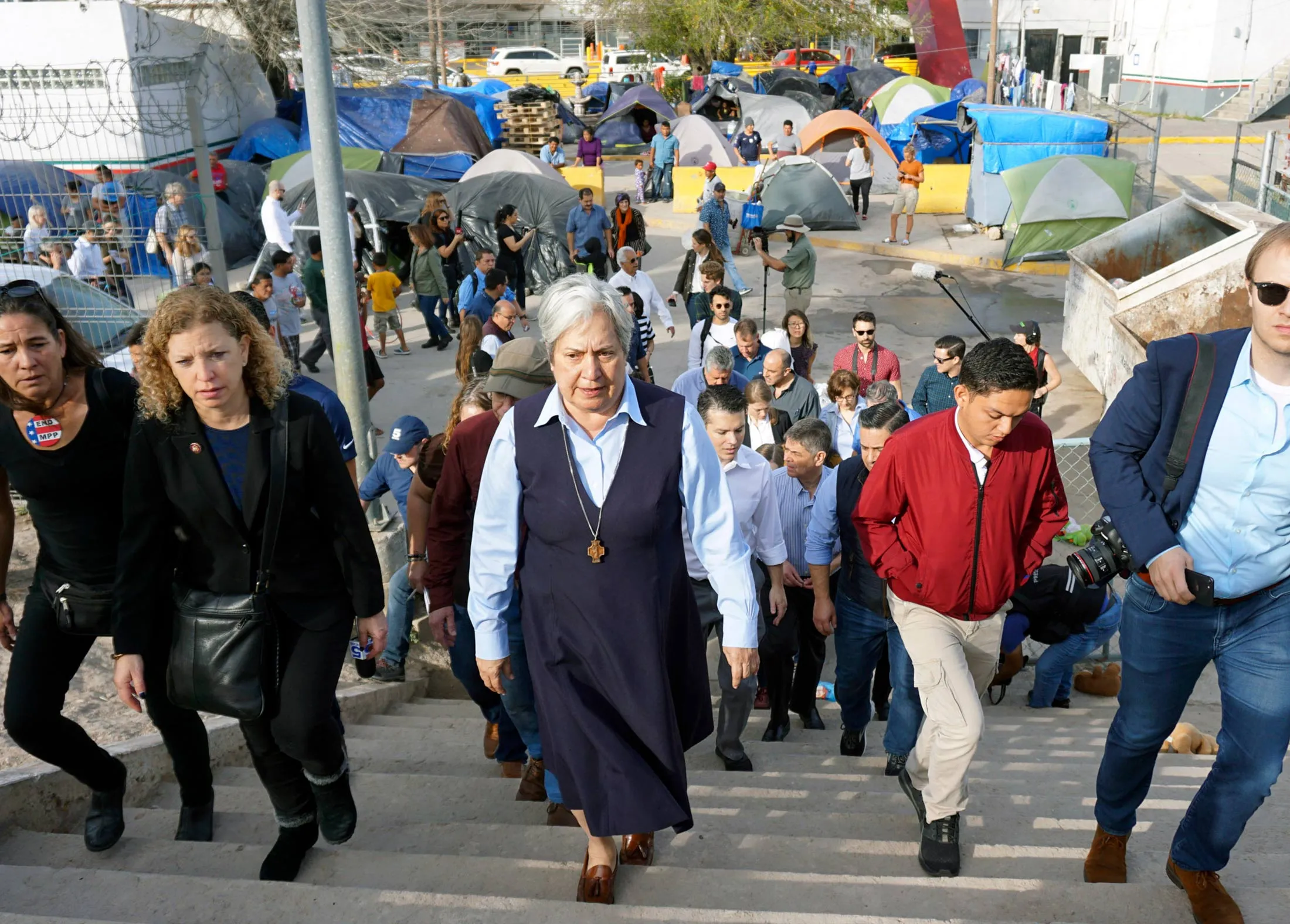 诺玛·皮门特尔姐妹(中)与国会代表团于1月17日在墨西哥马塔莫罗斯参观一个移民营。摄影师:米格尔·罗伯茨/布朗斯维尔先驱报/美联社闲聊被布朗斯维尔团队的领导之一塞尔吉奥·科尔多瓦打断,他白天是一名教育工作者,正在带领一整支志愿者队伍将我们卷入他们的使命。这是一支来自布鲁克林高地犹太教堂的队伍——律师、教师、一位拉比、一名护士,以及一群全能的好人。