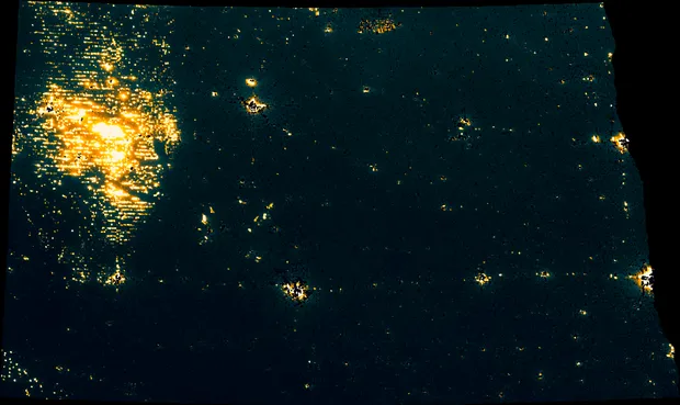 “如果你在北达科他州西部的亮点周围画一个框,并加总所有的光,那这个操作发出的光大约与芝加哥的市界发出的光相当,”Wallace说。这并不是巴肯页岩所独有的。2018年《揭示者》的调查发现,基于2013年NOAA的数据,鹰福特页岩的最亮部分与内华达州的雷诺一样明亮。