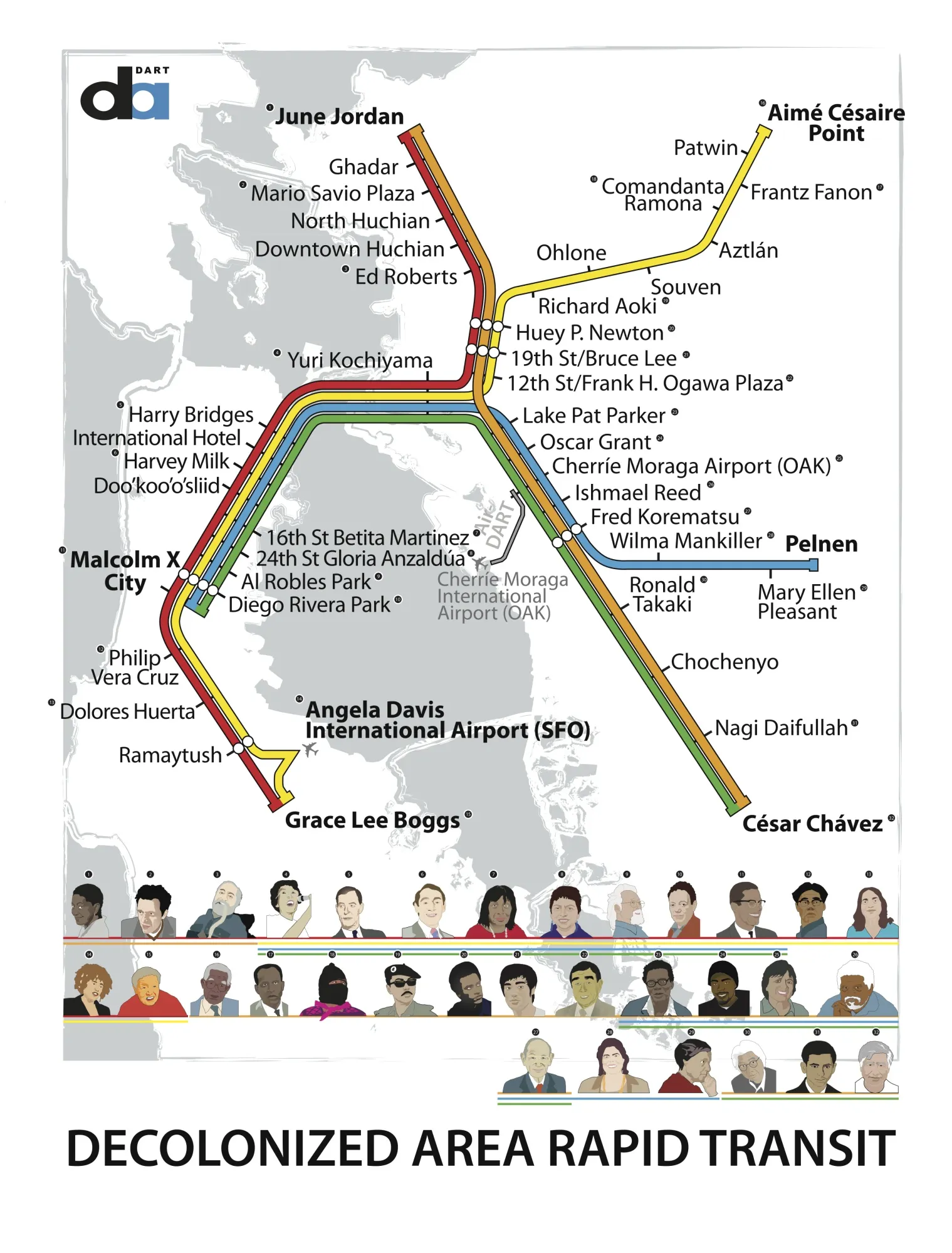 奥克兰博物馆新展览中的一张地图重新构想了一个更激进的BART系统。艺术家:刘建志这些作品中穿插着简短的文本片段,解释地图的功能,遵循各种主题:它们解释科学,投射制图者的偏见,使独特的经历可见,并帮助社区展望更光明的未来。“没有一张地图可以告诉你一个地方的所有信息,”介绍墙上的说明声称。