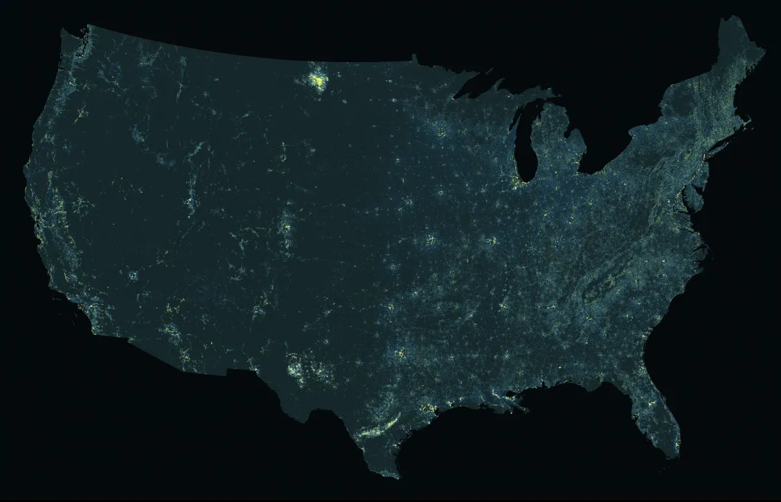 当夜间数据根据人口进行调整时,某些城市外的地区显得格外突出。制图者:蒂姆·华莱士对于 CityLab,琳达·潘写道,笛卡尔实验室的制图师蒂姆·华莱士如何从国家海洋和大气管理局绘制夜间光数据并根据人口进行标准化。