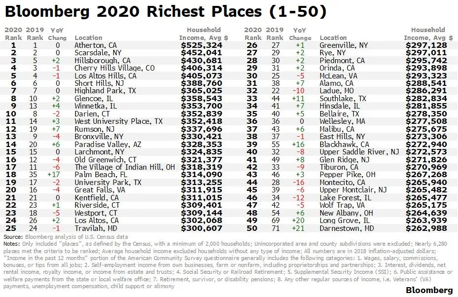 连续第四年,阿瑟顿在 彭博社的最富有地方年度指数中名列第一。 平均家庭收入超过525,000美元,它成为彭博社自2017年开始编制该指数以来,第一个也是迄今为止唯一一个超过五十万美元的社区。