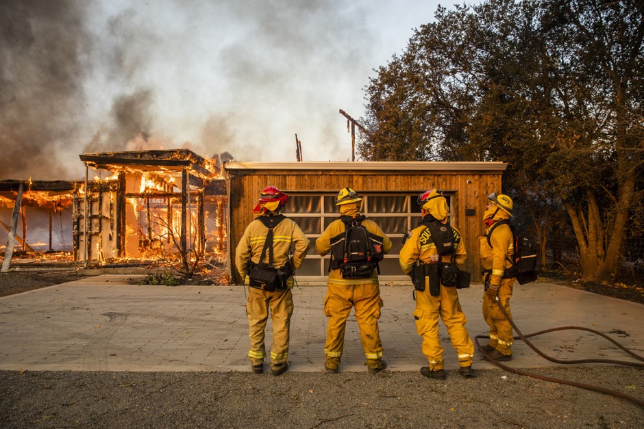 消防员在加利福尼亚州希尔兹堡的128号公路旁调查一处着火的房屋,时间是2019年10月。菲尔·帕切科/彭博社在加利福尼亚州的索诺玛县行驶,去年的火灾季节及之前的季节的残余是无法忽视的。黑ened的树木仍然沿着公路排列。一块标志,县内许多类似的标志之一,上面写着:“从灰烬中,我们将崛起。”