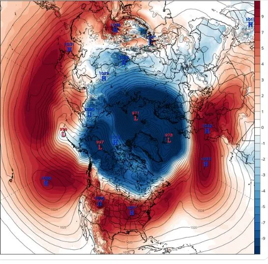 气压系统——被称为“北极振荡”——往往在低压和高压之间来回摆动,增强和减弱周围的极地风,气象学家表示,这种强度很少出现,其持续时间也很少如此之长。