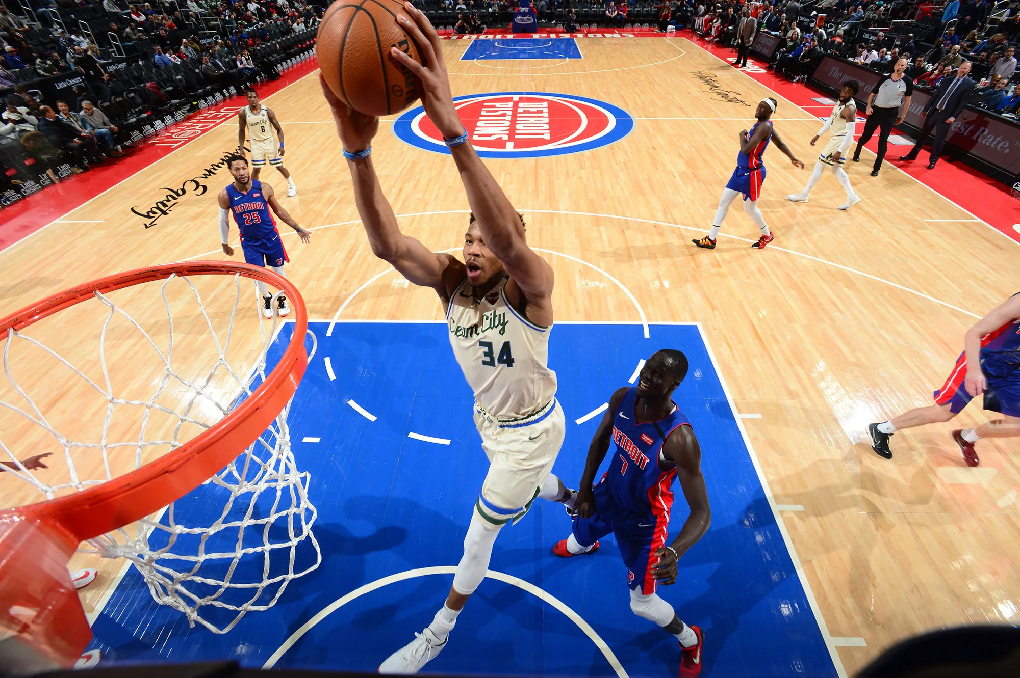 扬尼斯·阿德托昆博在2月20日对阵底特律活塞时投篮。