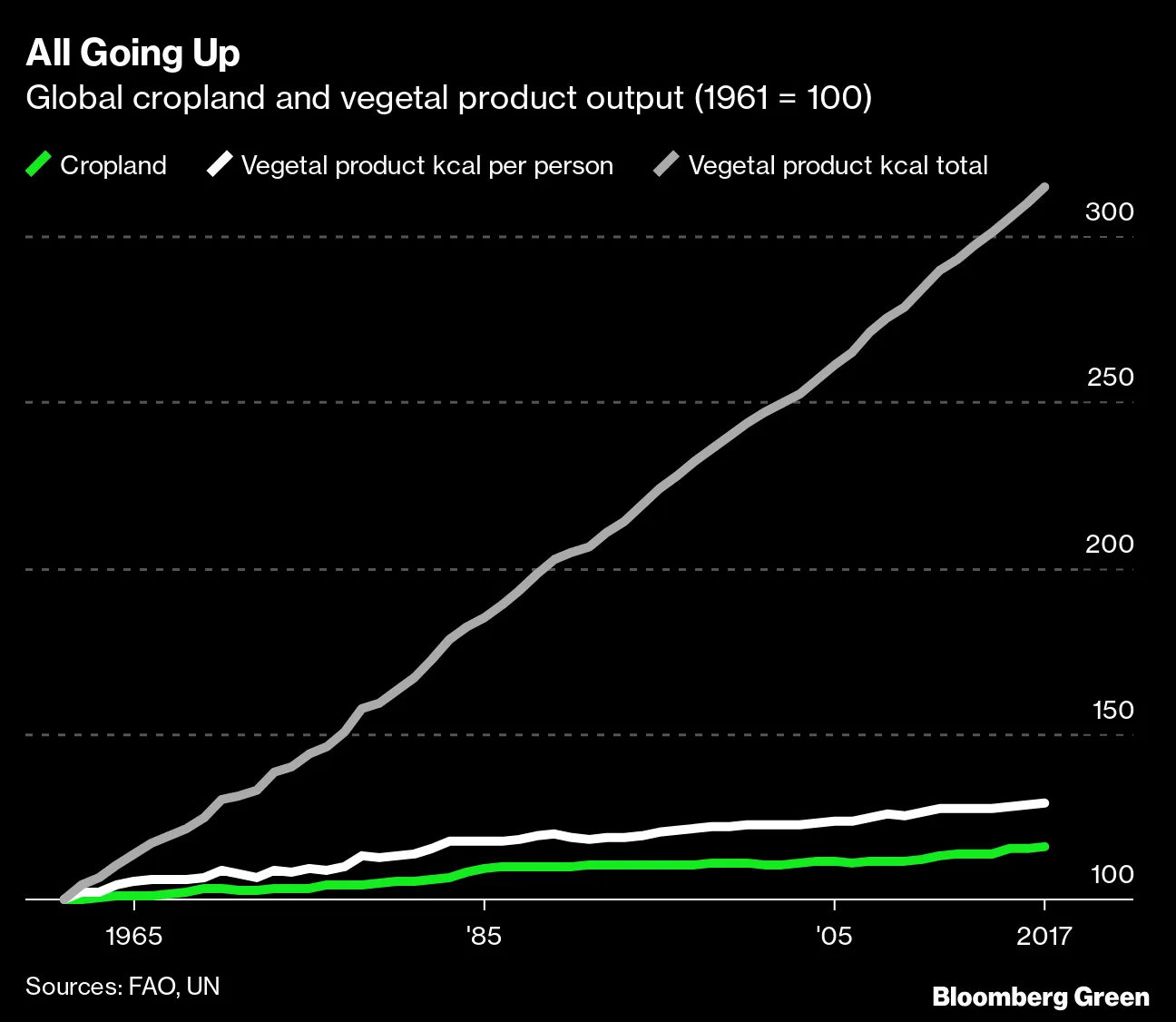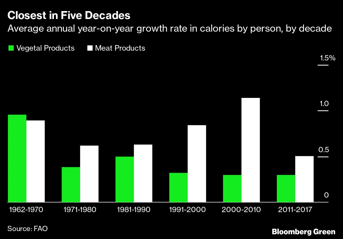 不过,仔细看看上面的图表,你会发现人均肉类卡路里的增长已经趋于平稳。自本十年以来,增长率正在放缓。与此同时,人均蔬菜卡路里自1960年代以来的增长幅度较小,约为肉类卡路里的一半。