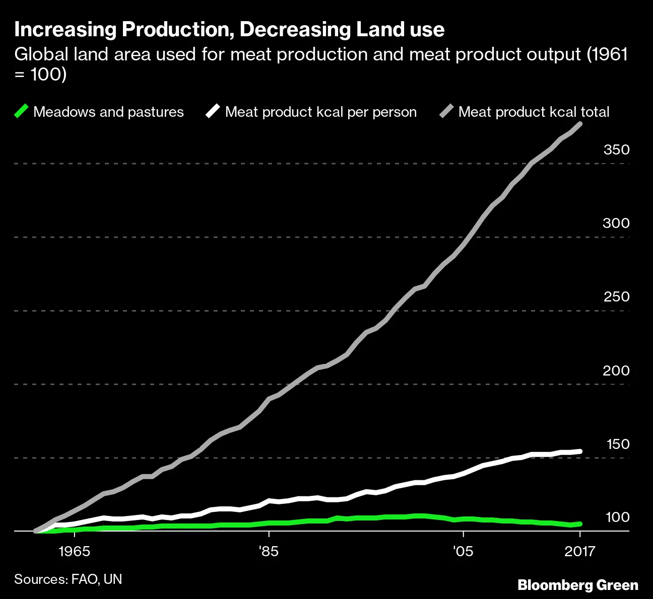 然而,“牛肉峰值”并不意味着“肉类峰值”。家禽和猪肉更有可能在工业化养殖中饲养,而不是在开放土地上放牧。根据联合国的数据,自1961年以来,肉类产品的卡路里总量几乎增加了四倍。