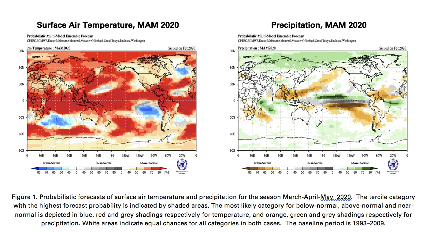 三月、四月和五月的地表空气温度预测。来源:概率多模型集合预报,世界气象组织2020年2月北欧和北半球的气温高于平均水平导致了能源需求减弱,并使天然气、煤炭和电力的价格暴跌。大西洋两岸的天然气价格接近二十多年来的最低水平,由于燃料过剩,需求增长受到全球经济放缓和冠状病毒疫情的威胁。