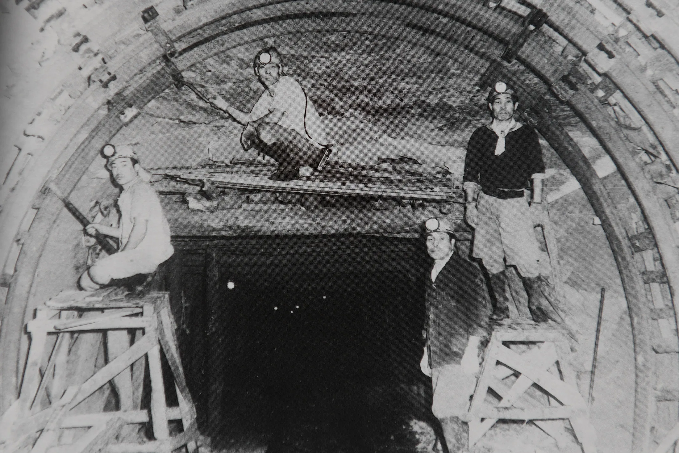 一张来自福岛县磐城市煤炭和化石博物馆的档案照片,显示了1962年在常磐煤矿工作的矿工。