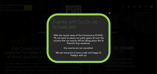 PubCrawls.com的活动页面上的弹出窗口表示,他们的圣帕特里克节活动将按计划继续进行。截图/PubCrawls.com尽管没有酒精,但游行对健康专家来说尤其令人担忧,因为冠状病毒在群体密集时似乎容易传播。疾病控制与预防中心建议人们保持“社交距离”(描述为与他人至少保持六英尺的距离)。对于密歇根大学的医学历史教授Markel来说,聚会的规模和范围几乎无关紧要。“大型游行、小型游行、组织的游行、无序的游行——现在在人群中,特别是如果你属于高风险群体,是绝对不明智的,”他说。更重要的是“谁在其中,以及你站在谁旁边。”