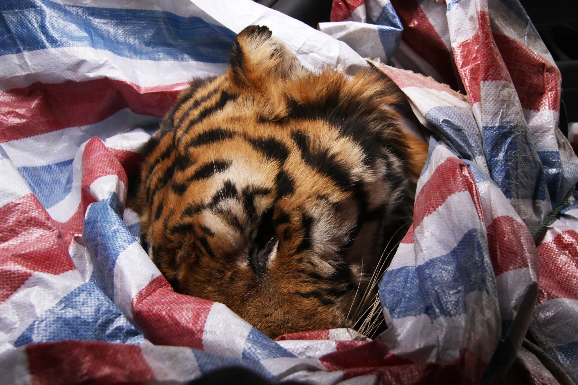 一只死去的西伯利亚虎被塑料袋包裹,躺在浙江省的一辆SUV内。2014年。