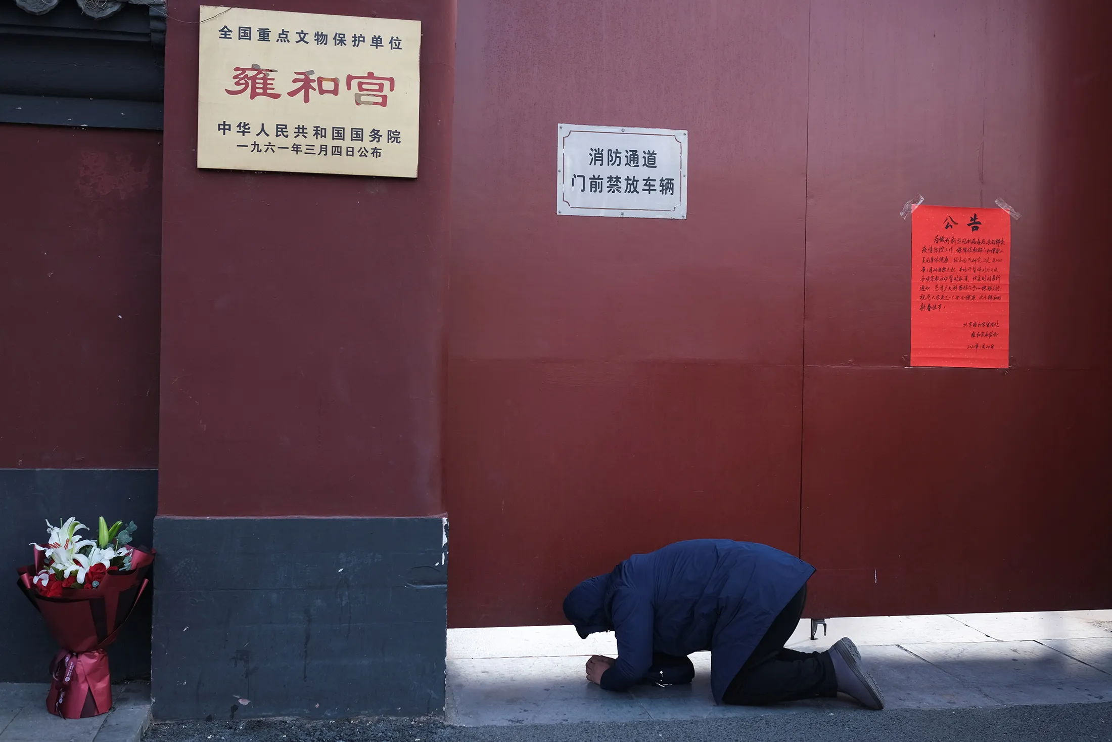 1月24日,一名男子在北京的拉玛寺外祈祷。门上的通知说寺庙因安全原因关闭。摄影师:卡洛斯·加西亚·拉林斯/路透社