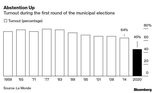 投票站依赖消毒过的笔、洗手液和选民之间保持的适当距离来进行 第一轮选举——这与通常的程序相比,变化并没有想象中那么戏剧性。投票率确实明显低于2014年最后一次全国市政投票,下降了19个百分点。