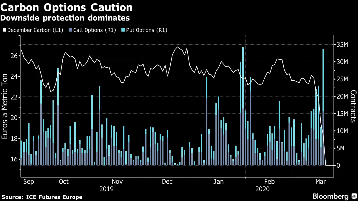 碳计划的期权市场也在发出对配额需求疲软的信号,交易者在最近几周更倾向于选择下行保护,因为期货价格下跌。