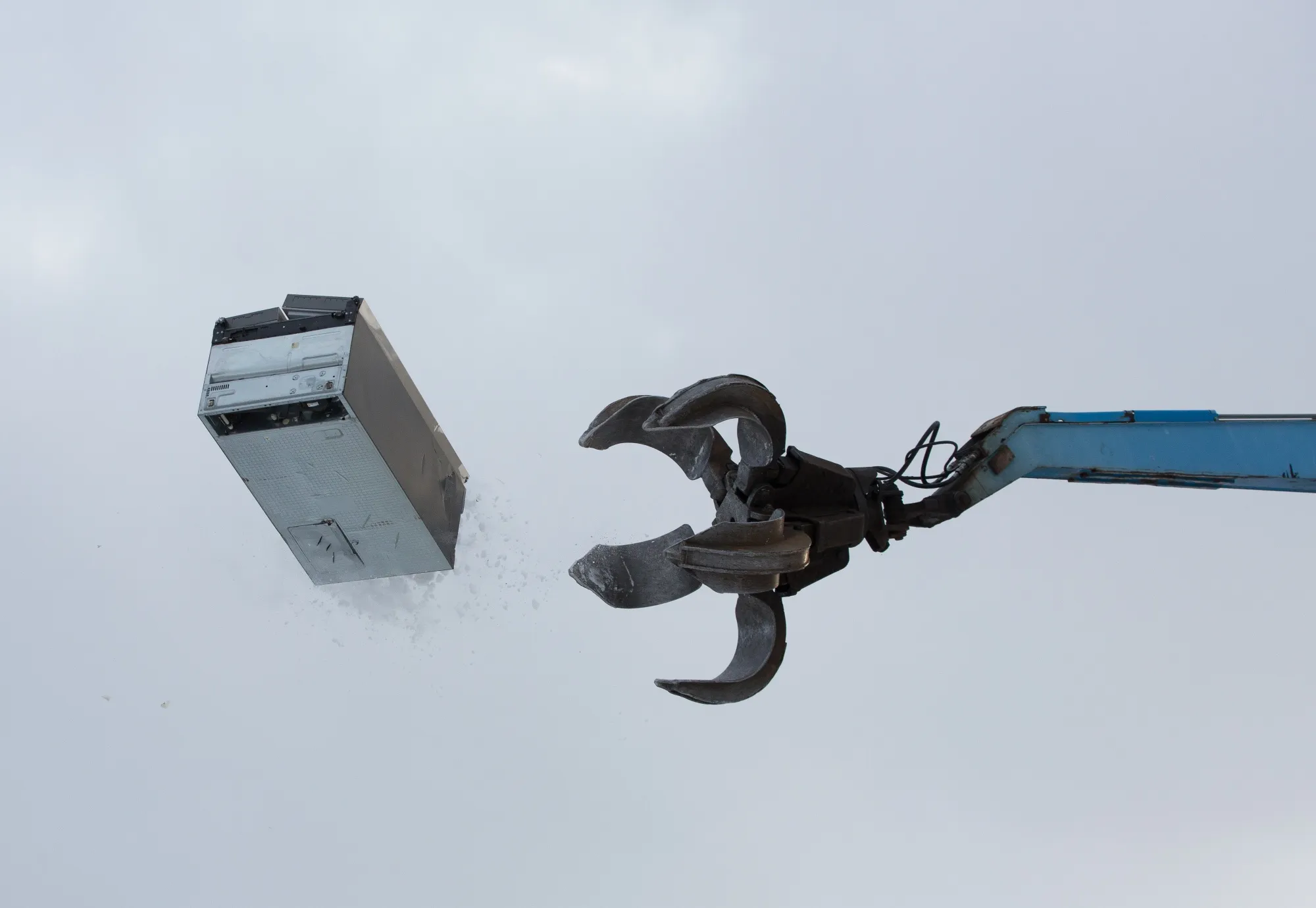 一台抓斗起重机在俄罗斯莫斯科郊外的Petromax JSC废物回收综合体的院子里扔掉了一台报废的冰箱,运营商为Kuusakoski Group Oy,时间是2020年1月23日,星期四。