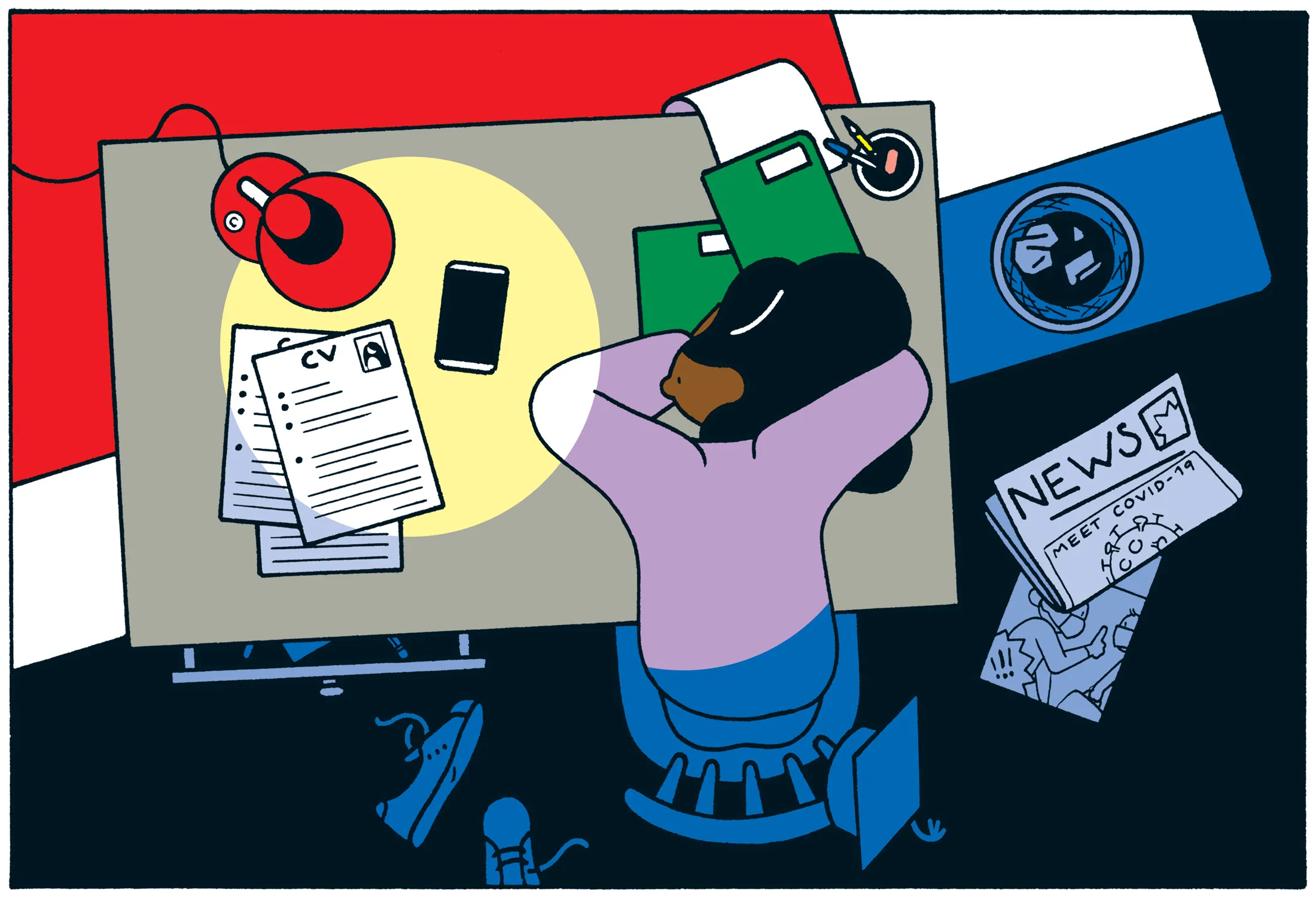 插图:Charlotte Pollet 为彭博商业周刊创作罗布·梅利克,印第安纳大学凯利商学院的MBA学生,原本安排了六场会议,参加一个由他所在学校共同赞助的三月中旬在加利福尼亚举行的风险投资会议,希望能建立联系,帮助他在技术或金融服务行业找到职位。当由于Covid-19疫情取消该活动时,这些会议被转为电话或在线会议,通过Skype、Zoom和Google Hangout进行。