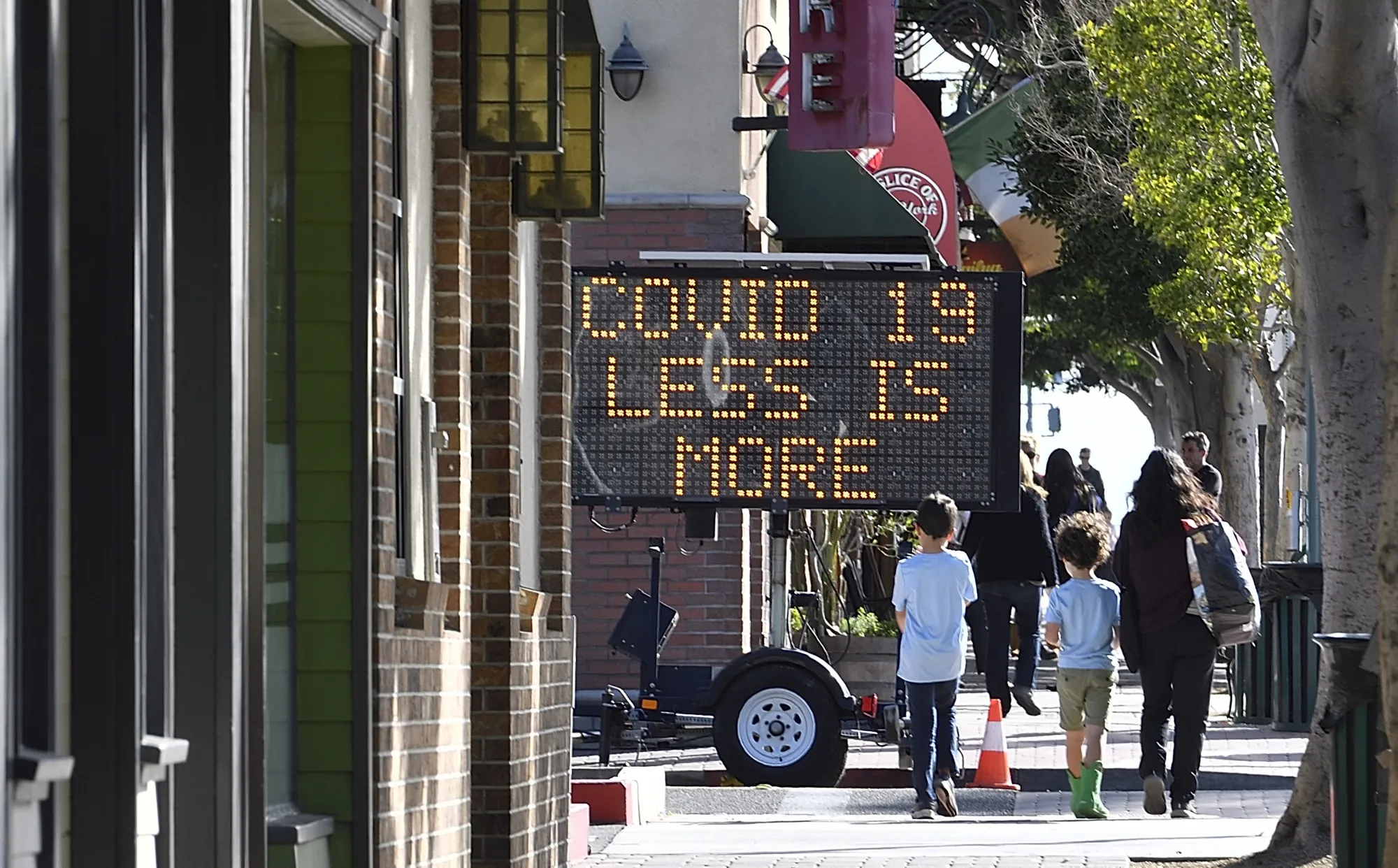 2020年3月17日,加利福尼亚州海滩市主街上的冠状病毒警告标志。