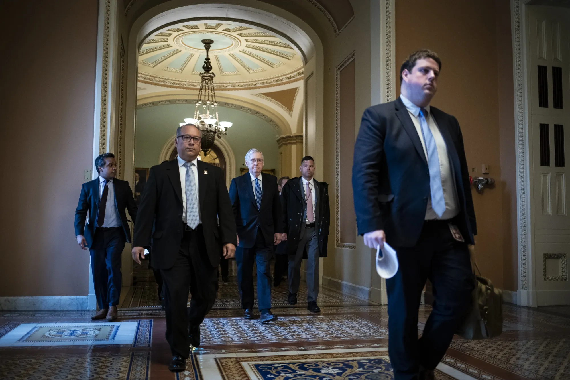 米奇·麦康奈尔,中央,走向他在美国国会大厦的办公室,日期为3月23日。摄影师:阿尔·德拉戈/彭博社企业利益并不是唯一寻求从国会通过的2万亿美元救助计划中分一杯羹的群体。环保人士也渴望在紧急援助中附加条件——并引发了共和党的愤怒。