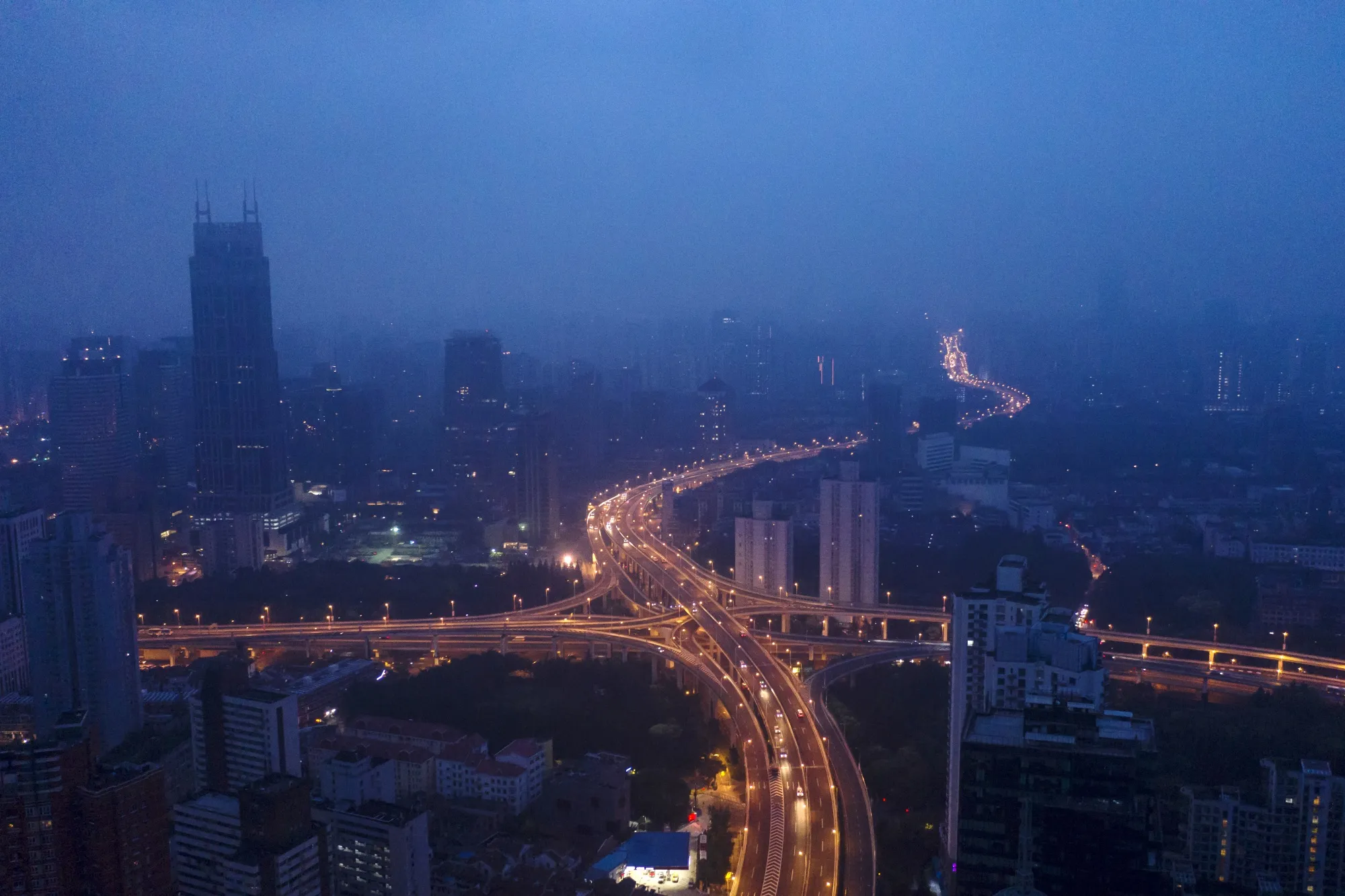 雾霾笼罩着2019年8月的上海高速公路和建筑。