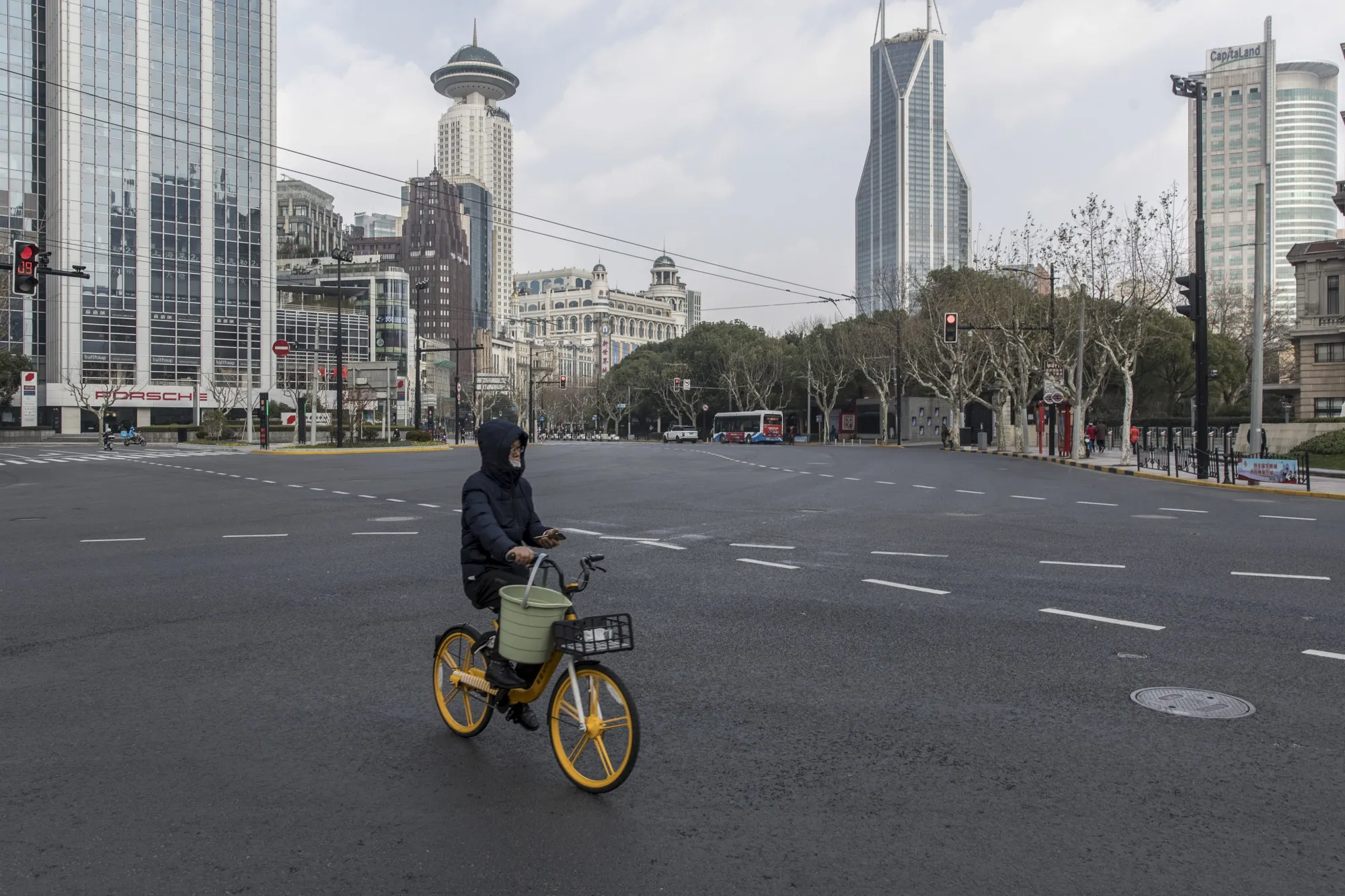 一名骑自行车的人在1月29日的上海南京路上穿行,这条通常繁忙的商业街几乎空无一人。