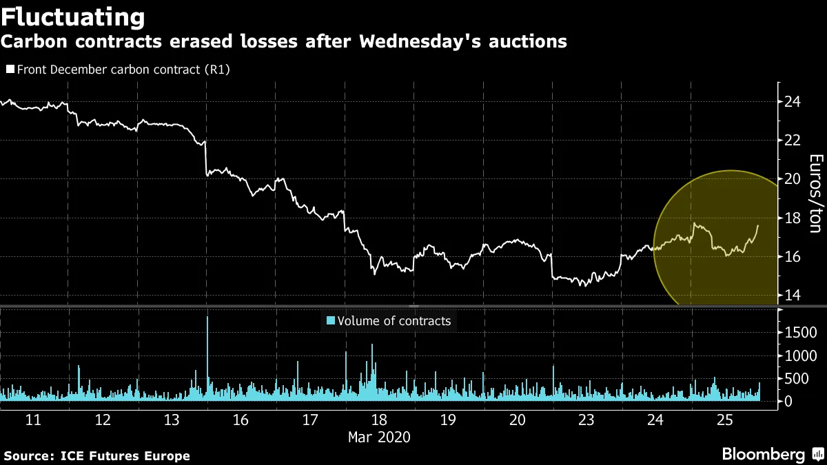 由于许多航班停飞,碳价下滑,对这些证券的需求正在减弱。数千个工业场所、发电厂和航空公司被要求购买其温室气体污染的配额。但随着经济和能源使用的减弱,他们对这些许可证的需求也在下降。