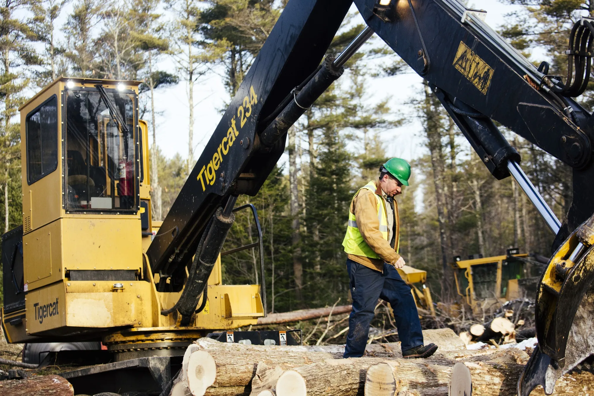 一名伐木工人在喂木材进入碎木机后,沿着堆叠的木材走,木材将作为生物质燃料送往缅因州布伦瑞克的ReEnergy。