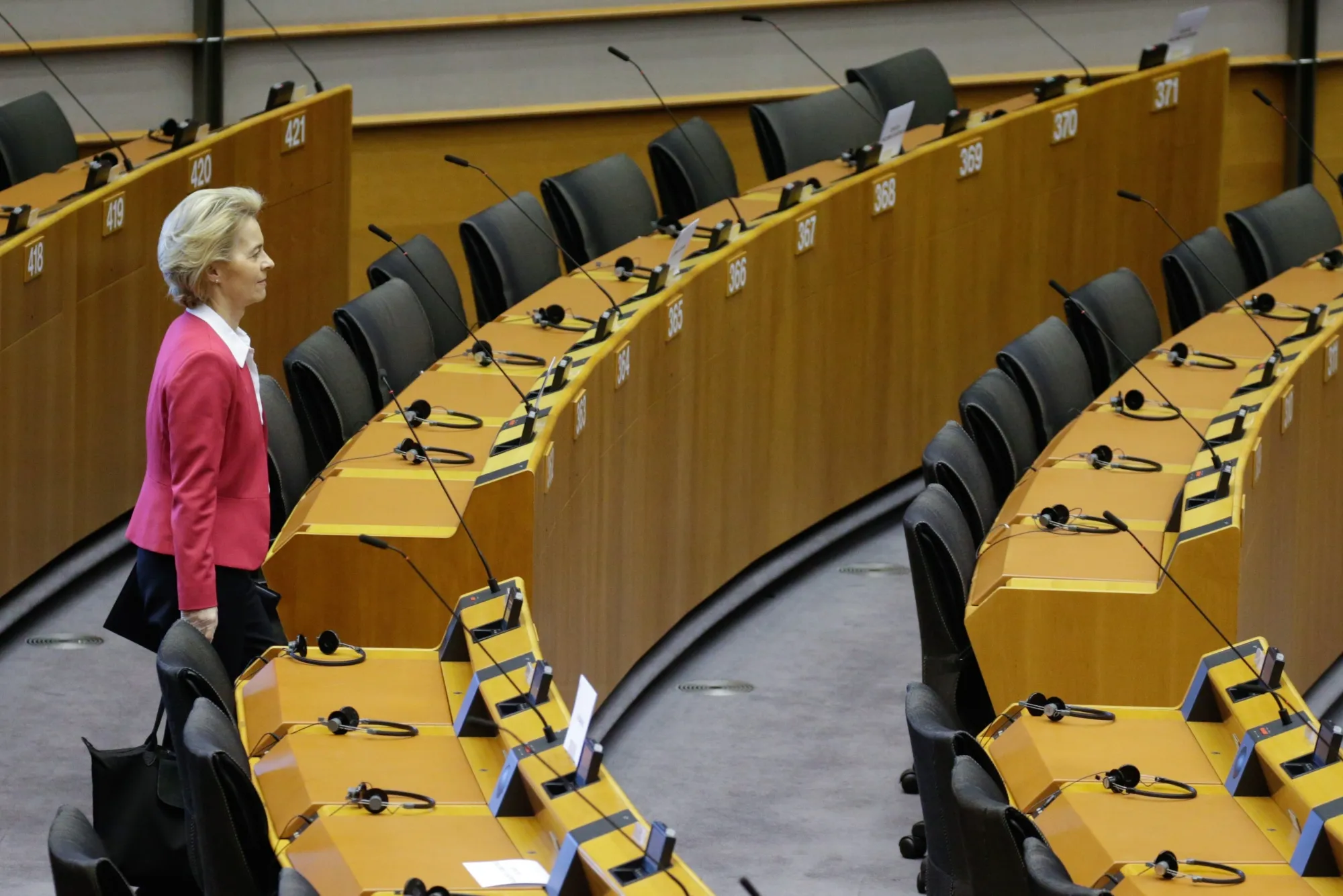 欧洲委员会主席乌尔苏拉·冯德莱恩于2020年3月26日在比利时布鲁塞尔参加欧洲议会的迷你全体会议。
