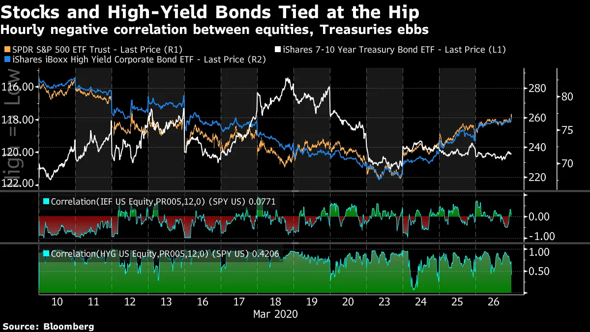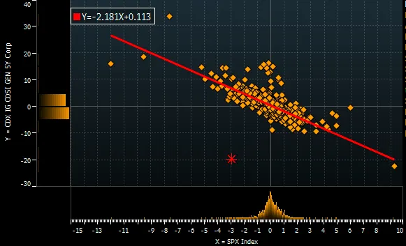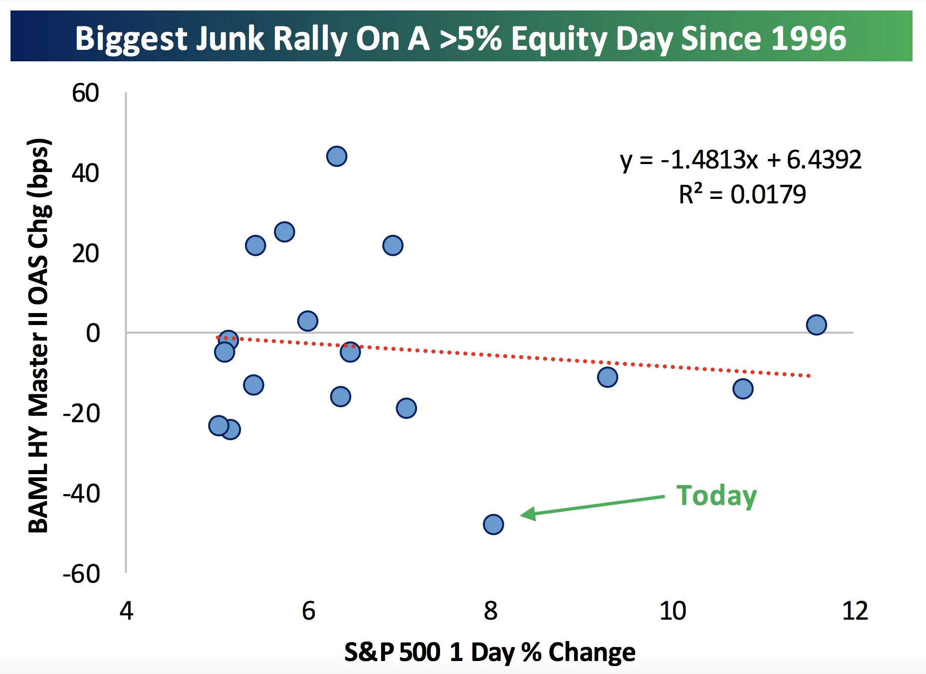 LQD,一只投资级债券ETF,在中央银行宣布后周一飙升了7.4%。投资级五年CDX(大幅收紧)相对于标准普尔500指数(大幅下跌)的相对表现是该指数历史上最大的。