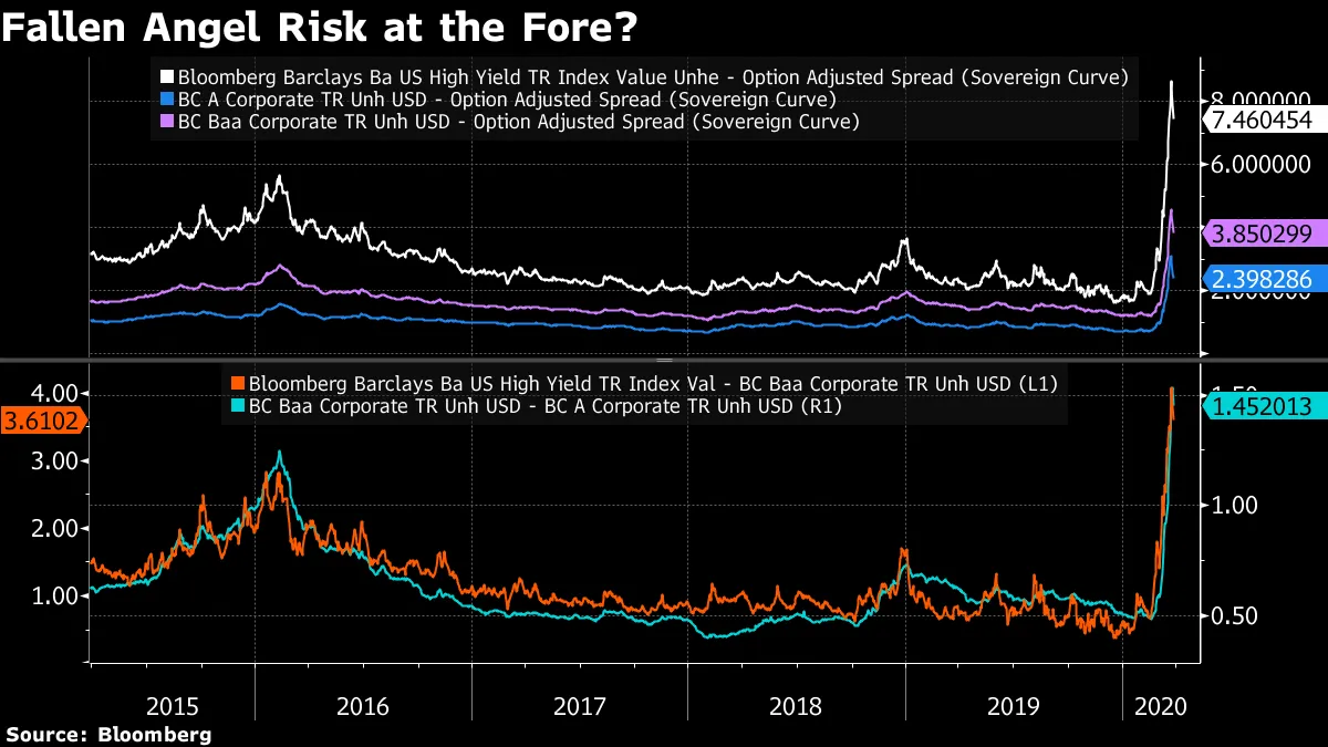 “2016年,欧洲高收益市场在欧洲央行企业部门购买计划启动后经历了一轮大规模的评级升级周期,”他写道。“显然,我们并不预测美国高收益市场会出现升级周期,因为现在正处于衰退,但我认为,边际上,评级较低的美国投资级公司现在应该更愿意为其投资级评级而奋斗。”
