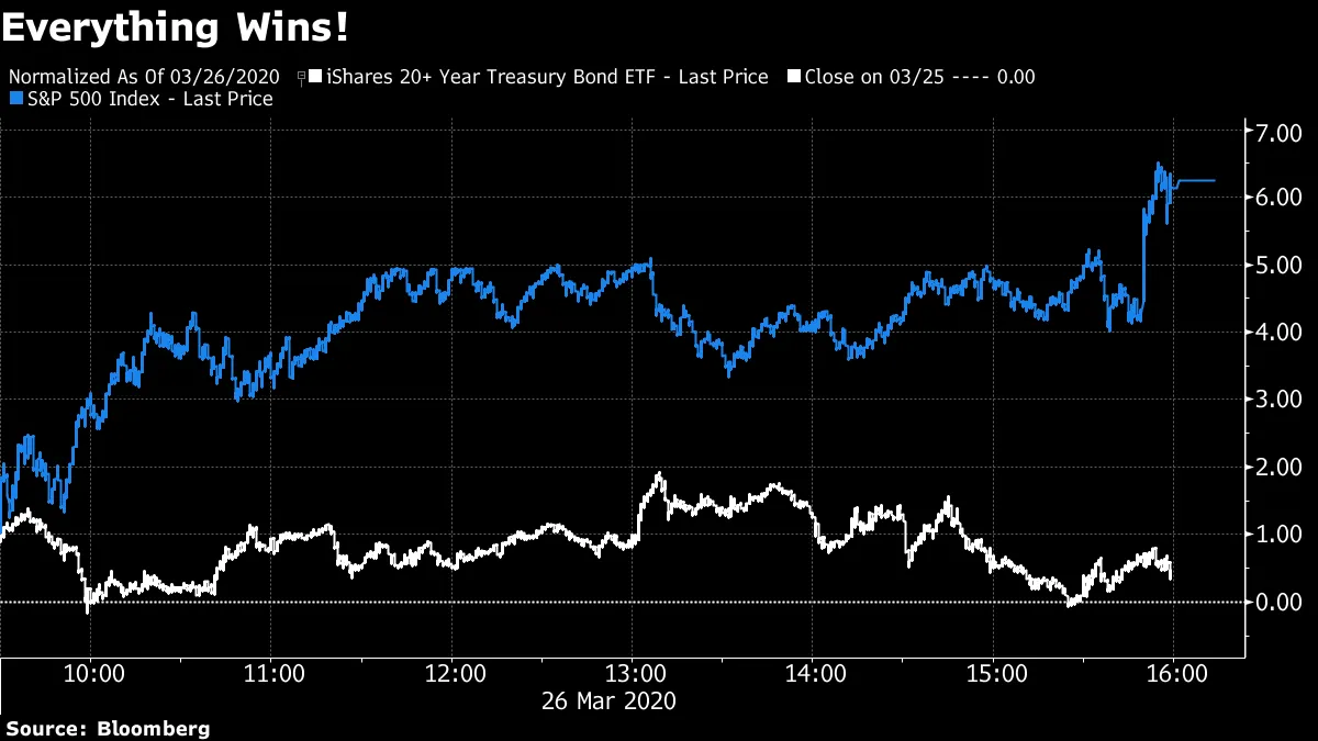 与其说是风险偏好与风险规避,不如说最近的价格走势可以更宽容地描述为从“流动性关闭”状态回归到“流动性开启”状态。一切都在上涨:这是自2002年以来,标准普尔500指数首次上涨6%或更多,而长期债券(以TLT ETF为代理)至少上涨0.4%。
